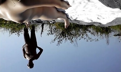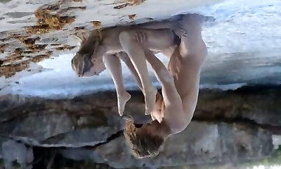 Light haired hot tramp attacked long beef whistle of bizarre dude right on stone riverbank