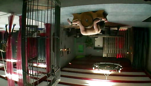 大型荡妇鞭打在颠倒的悬挂